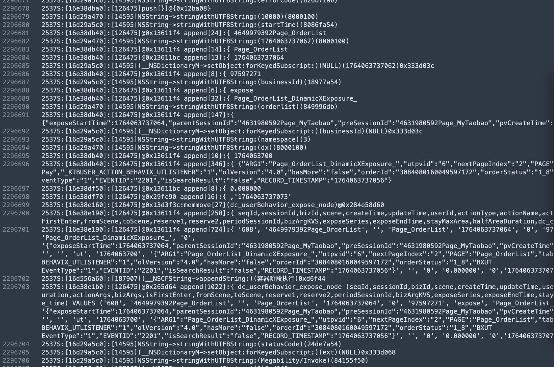 我通过修改 淘宝 的 iOS 应用包,制作了一个自定义的插桩工具,使其在运行过程中能够自动记录关键函数调用和参数。IPA 使用 Sideloadly 等方式安装,运行后生成的日志文件可以直接在 macOS 的 Finder 中访问(例如:log_0x0_0x0.txt、log_0x0_0x0_259.txt 等)。