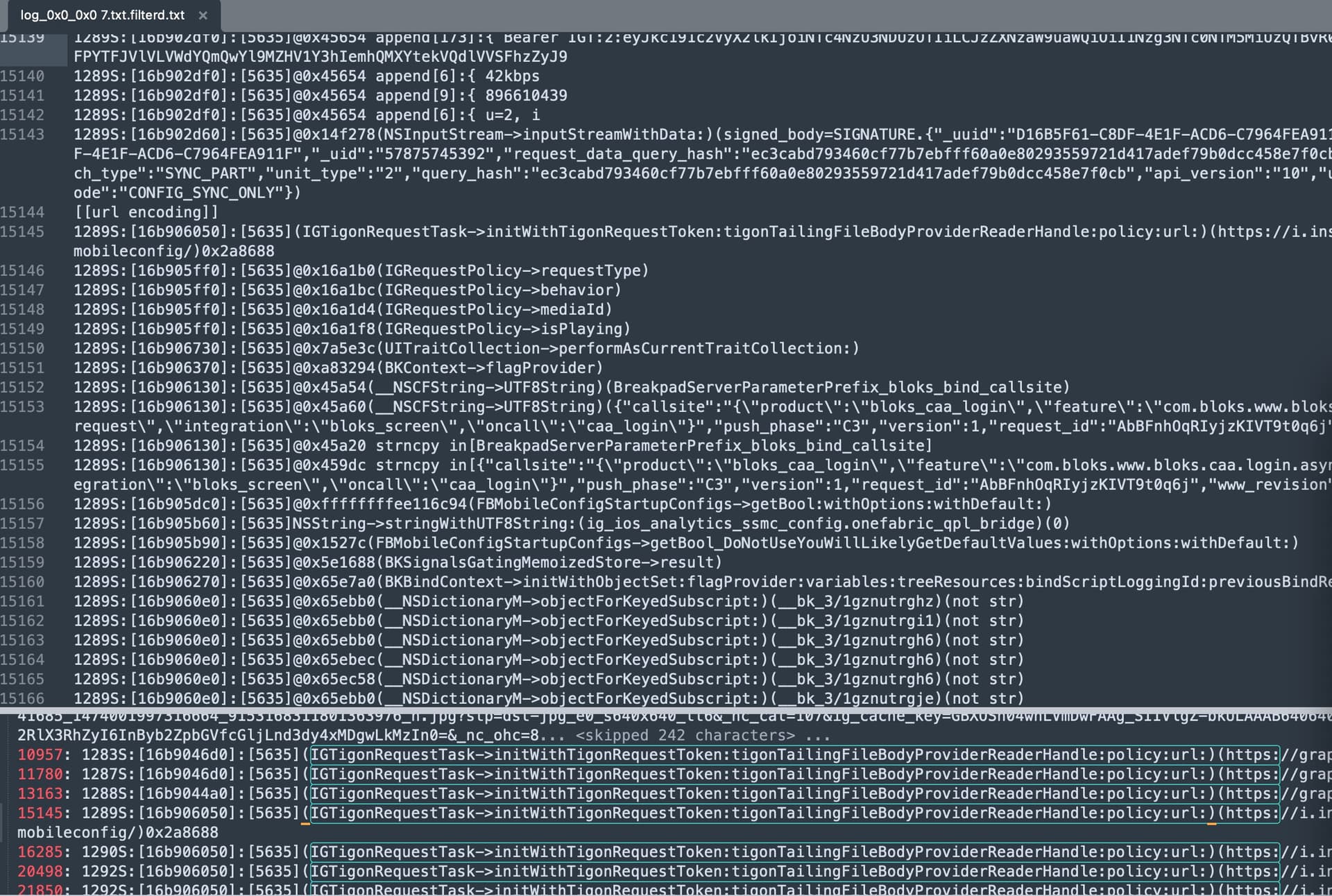 由于 Instagram 在本地并未使用特别复杂的加密函数,分析系统调用基本足够。对于字符串类参数,日志已经能直接观察;对于不可见数据,也会记录为十六进制。