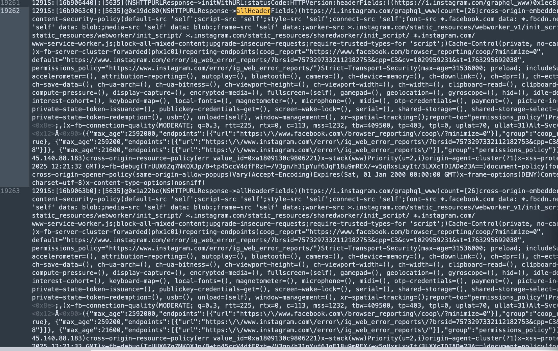 我通过修改 Instagram 的 iOS 应用包,制作了一个自定义的插桩工具,使其在运行过程中能够自动记录关键函数调用和参数。IPA 使用 Sideloadly 等方式安装,运行后生成的日志文件可以直接在 macOS 的 Finder 中访问(例如:log_0x0_0x0.txt、log_0x0_0x0_259.txt 等)。