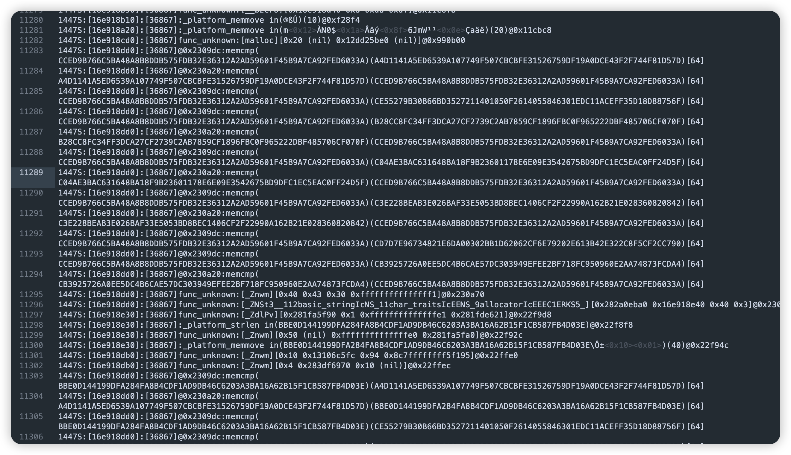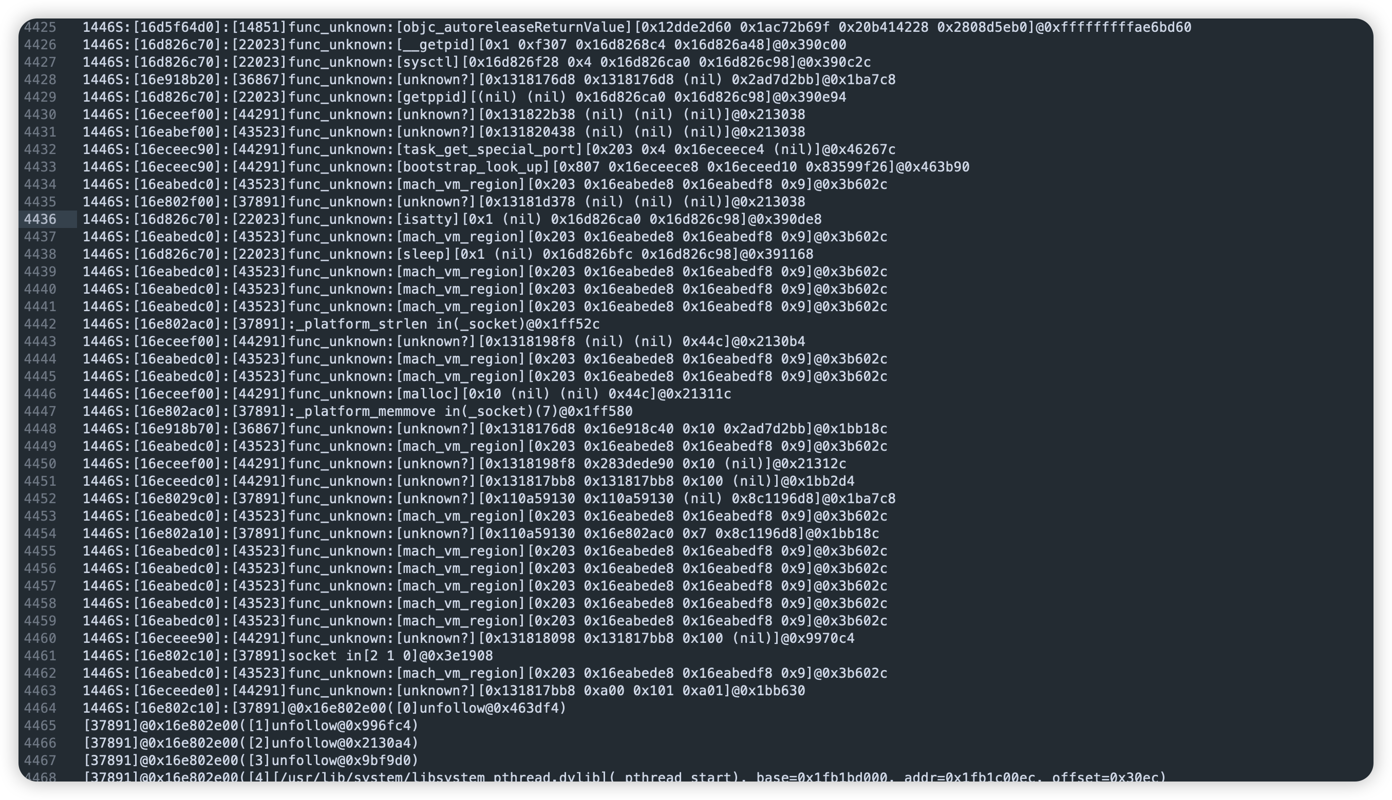 通过修改相应程序的ipa应用包,制作了自定义的插桩工具进行静态二进制重新静态JIT(当然大部分情况下只是记录一些关键函数调用,JIT主要是为了实现透明化无干扰跟踪,平时大家用的一些模拟执行unidbg之类的工具就是完全透明无干扰,当然如果不算执行效率的话,因为这太慢了),使其在运行过程中能够自动记录关键函数调用和参数。IPA 使用 Sideloadly 等方式安装,运行后生成的日志文件可以直接在 macOS 的 Finder 中访问(例如:log_0x0_0x0.txt、log_0x0_0x0_259.txt 等)。